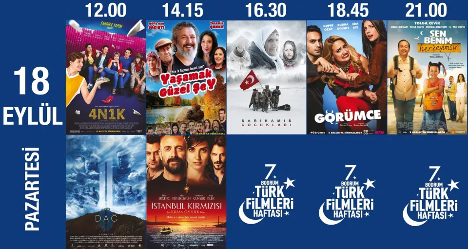 Kültür ve Turizm Bakanlığı Sinema Genel Müdürlüğü, Bodrum Belediyesi, Kos (İstanköy) Belediyesi ve Oasis Alışveriş Merkezi’nin katkıları ile Bodrum Sinema ve Kültür Derneği, Cinemarine Sinemaları, Sinema Salonu Yatırımcıları Derneği (SİSAY) ve Magazin Gazetecileri Derneği (MGD) tarafından düzenlenen Bodrum Türk Filmleri Haftası, 18-24 Eylül tarihleri arasında 7. kez sinemaseverler ile buluşacak.