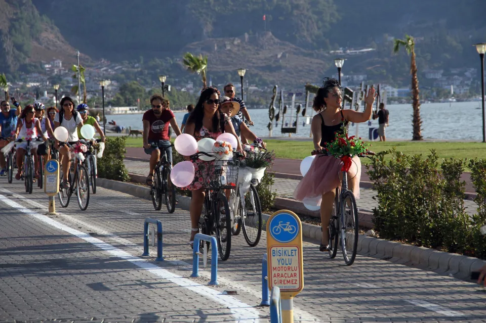 Fethiye ilçesi Beşkaza Meydanı’nda toplanan yaklaşık 120 kadın, Cahit Gündüz Caddesi'nden Balıkçılar Barınağı'na kadar pedal çevirdi. "Otomobilden in, bisiklete bin" sloganları eşliğinde 10 kilometrelik parkuru tamamlayan kadınlara turun ardından belediye tarafından sığla fidanı hediye edildi.