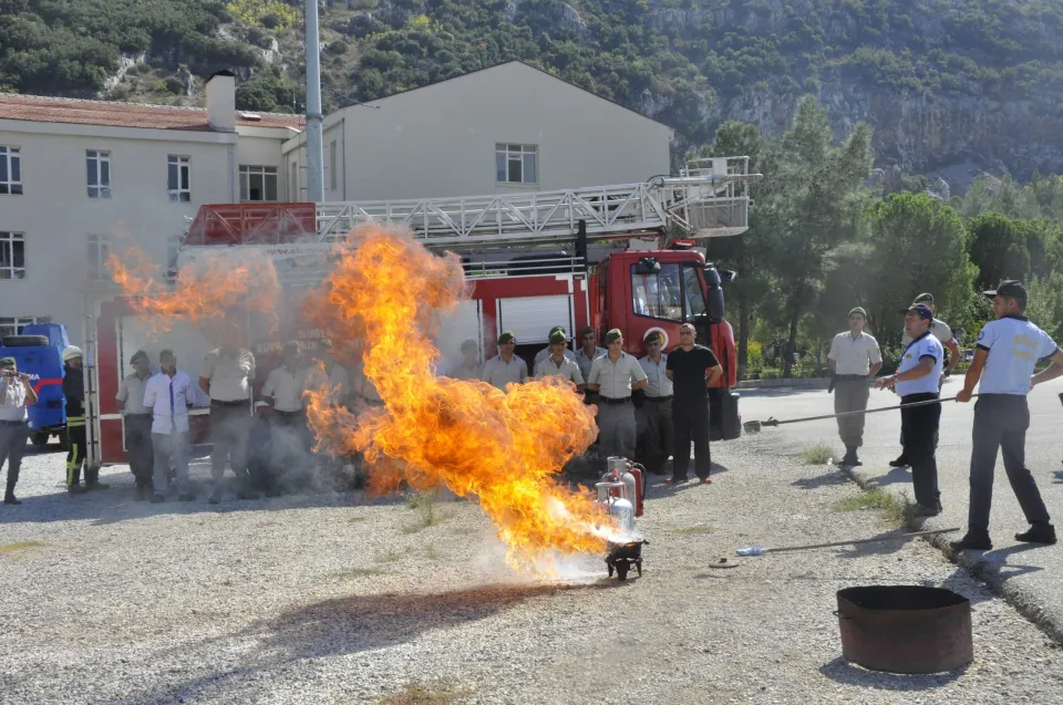 Muğla Büyükşehir Belediyesi İtfaiye ekipleri, Muğla İl Jandarma Komutanlığı’nda jandarma erlerine yangın eğitimi verdi. Uygulamalı olarak düzenlenen eğitimde jandarma erlerine, İtfaiye personeli tarafından yangın malzemelerinin kullanımı, yangından sonra yapılacak işlemler, yangının nedenleri ve etkenleri, yangın önleyici tedbirler, yangın ve yangınların sınıflandırılması anlatıldı. Ekipler ayrıca yangın söndürme yöntemleri, söndürücü maddelerin özellikleri ve yangın söndürme cihazları, iş sağlığı ve güvenliği, itfaiyede haberleşme, ilk yardım ve kurtarma faaliyetleri konularında bilgiler verdi. Muğla Büyükşehir Belediyesi’nden yapılan açıklamada ; “Vatandaşların yangın ve doğal afetler konusunda bilinçlendirmek için çalışıldığı ve bu çalışmalar ile olası bir yangında meydana gelebilecek can ve mal kaybını en aza indirmeyi amaçlandığı belirtildi.”