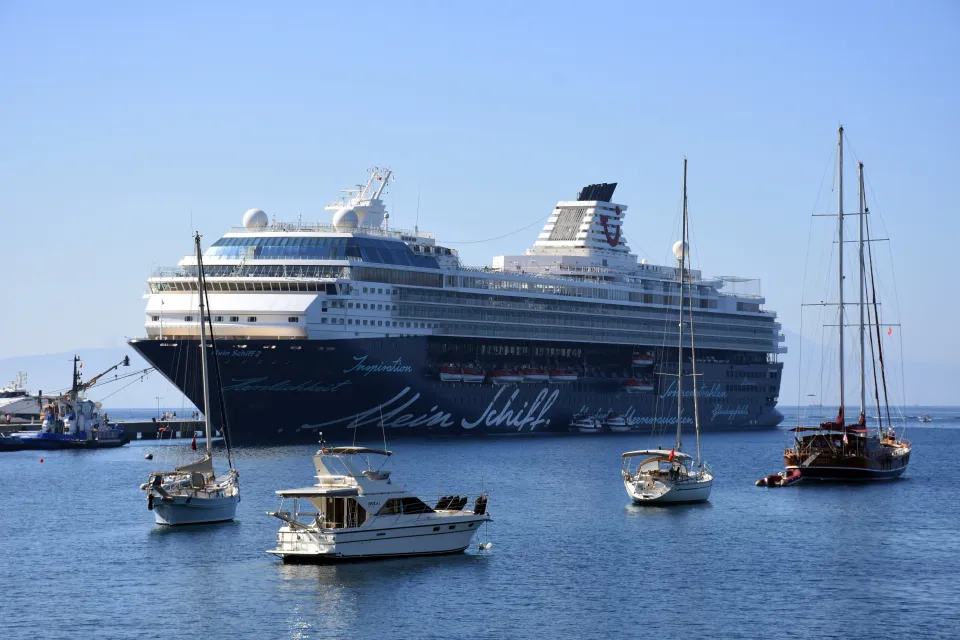 Yunanistan'ın Mikonos Adası'ndan gelen, çoğunluğu Alman 2 bin 69 yolcu ile 822 personel bulunan geminin, bu sezon ilçeye 12'inci seferini yaptığı öğrenildi.