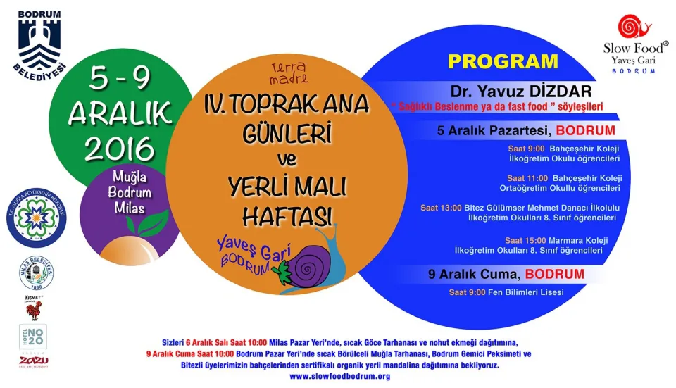 Bodrum Belediyesinin destekleri ve Yaveş Gari Yerel Grubu tarafından düzenlenen IV. Slow Food Toprak Ana Günleri ve Yerli Malı Haftası 5-9 Aralık 2016 tarihleri arasında Bodrum, Milas ve Muğla'da gerçekleşecek.