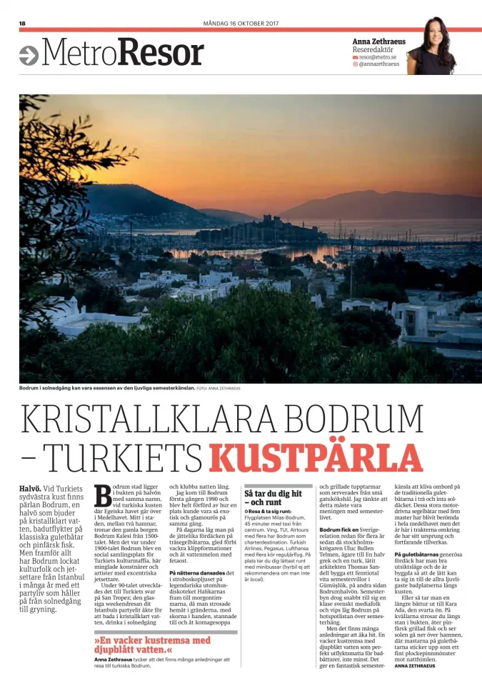 İsveçli heyet, ülkelerine döndüklerinde ise Metro Gazetesi ve Metro Mode ekinde Bodrum hakkında tanıtıcı bilgilerin yer aldığı 2 sayfalık bir makale yayınladı. Makalede Bodrum Kalesi eşliğinde Bodrum gün batımı manzarasının olduğu fotoğraf dikkat çekerken kahvaltı, brunch ve Bodrum sebze pazarı ile Bodrum’un yöresel lezzetlerini gösteren fotoğraflar ve bilgilere yer verildi. Gazetenin diğer sayfalarında da konuyla ilgili duyurular yapıldı.