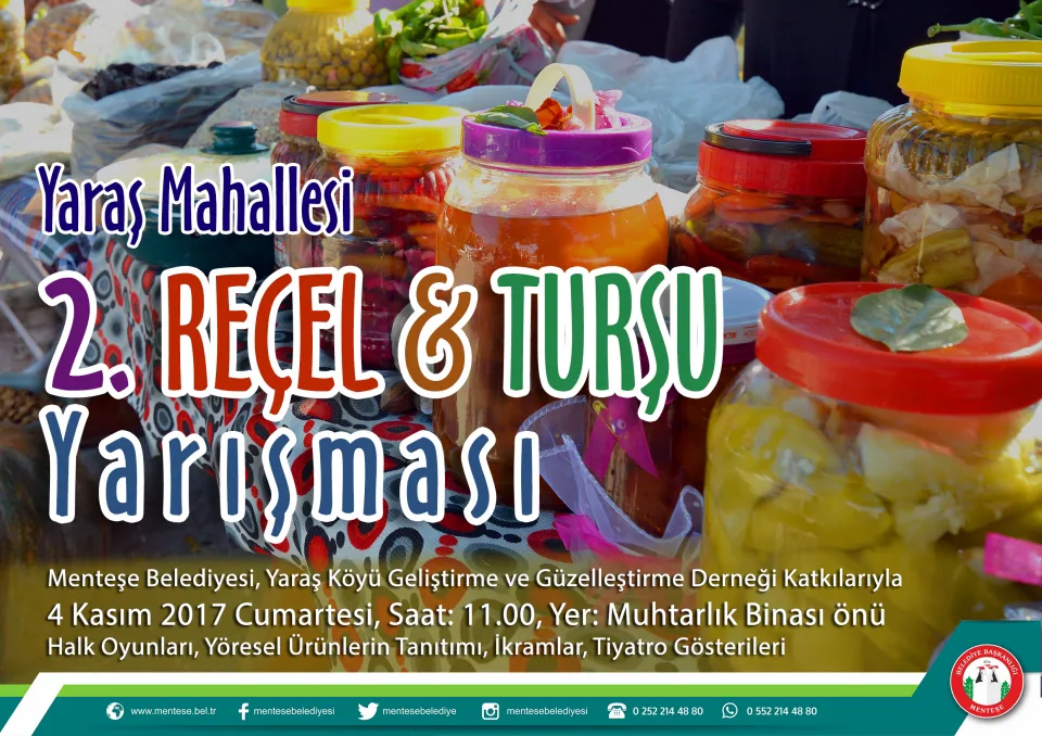 İlki geçtiğimiz yıl düzenlenen reçel ve turşu yarışması hakkında bilgi veren Başkan Gümüş, “Reçel ve Turşu yarışmasının ilkini, geçtiğimiz yıl Kültür ve Sanat Şenliklerimiz kapsamında düzenlemiştik. Yarışma hem Yaraş Mahallesi sakinleri, hem de etkinliğe katılan vatandaşlarımızın yoğun ilgisini görmüştü. İkincisinin düzenlenmesi için çok sayıda talep aldık. Açıkçası gelen talepler bizleri de mutlu etti ve yarışmanın ikincisini düzenlemeye karar verdik. Amacımız Menteşemizi ve mahallelerimizi tanıtarak, kültürümüzü yaşatmak.” dedi. Birbirinden lezzetli reçel ve turşuların yarışacağı 2. Reçel ve Turşu Yarışması, 04 Kasım 2017 Cumartesi Günü Saat: 11.00’de Yaraş Mahallesi Muhtarlık Binası önünde yapılacak. Etkinlikte Menteşe Halk Oyunları ekibi gösterileri, ikramlar ve yöresel ürünlerin tanıtımı yapılacak.
