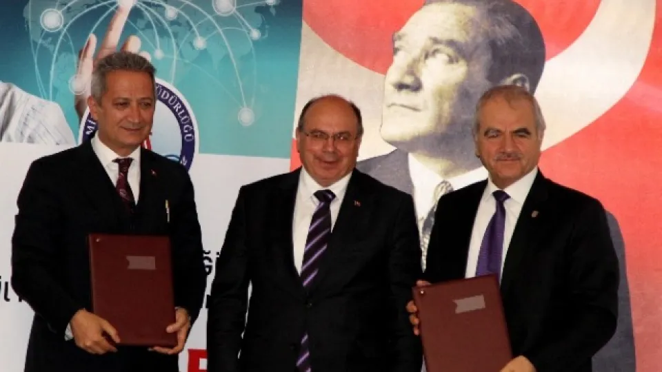 Konuşmaların arasında Vali Çiçek, Rektör Harmandar ve Milli Eğitim Müdürü Ekinci protokolü imzaladı.