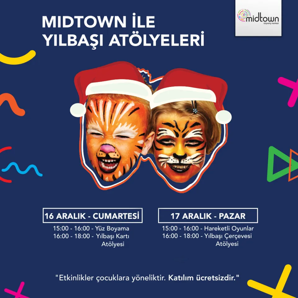 Midtown Alışveriş Merkezi, 16-17 Aralık tarihlerinde çocuklara yönelik yılbaşı atölyeleri düzenliyor. Yüz boyama ve hareketli oyunların da yer alacağı atölyelerde yılbaşı kartı ve yılbaşı çerçevesi yapılacak.