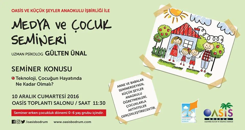 Oasis Alışveriş Merkezi Bodrumlu ebeveynlerin sorularına cevap bulabilecekleri bir seminere daha ev sahipliği yapıyor. Oasis Alışveriş Merkezi ve Küçük Şeyler Anaokulu İşbirliği ile gerçekleştirilecek olan “Medya ve Çocuk Semineri”, teknolojinin 0-6 yaş grubu çocukların hayatlarında ne kadar yer edinmesi gerektiğini irdeleyecek. Uzman Psikolog Gülten Ünal tarafından verilecek olan seminer 10 Aralık Cumartesi günü Oasis Toplantı Salonu’nda gerçekleştirilecek.