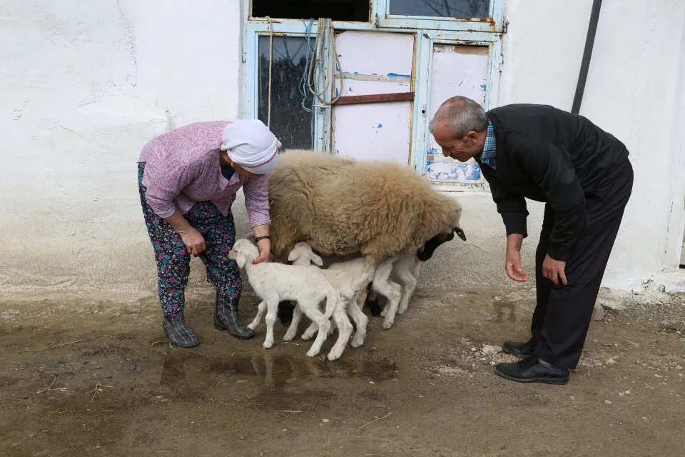 Şengül Yılmaz, 4 kuzunun doğumunu yaptırıp ahırdan ayrıldı. Bir süre sonra kuzulara bakmak için ahıra dönen Yılmaz, koyunun tekrar doğum yaptığını görünce şaşırdı.