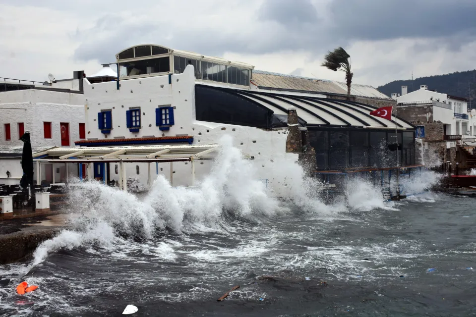 Bodrum'da saatteki hızı zaman zaman 50 kilometreyi bulan keşişleme nedeniyle dalgalar kıyıdaki iş yerlerinin balkonlarına ulaştı.