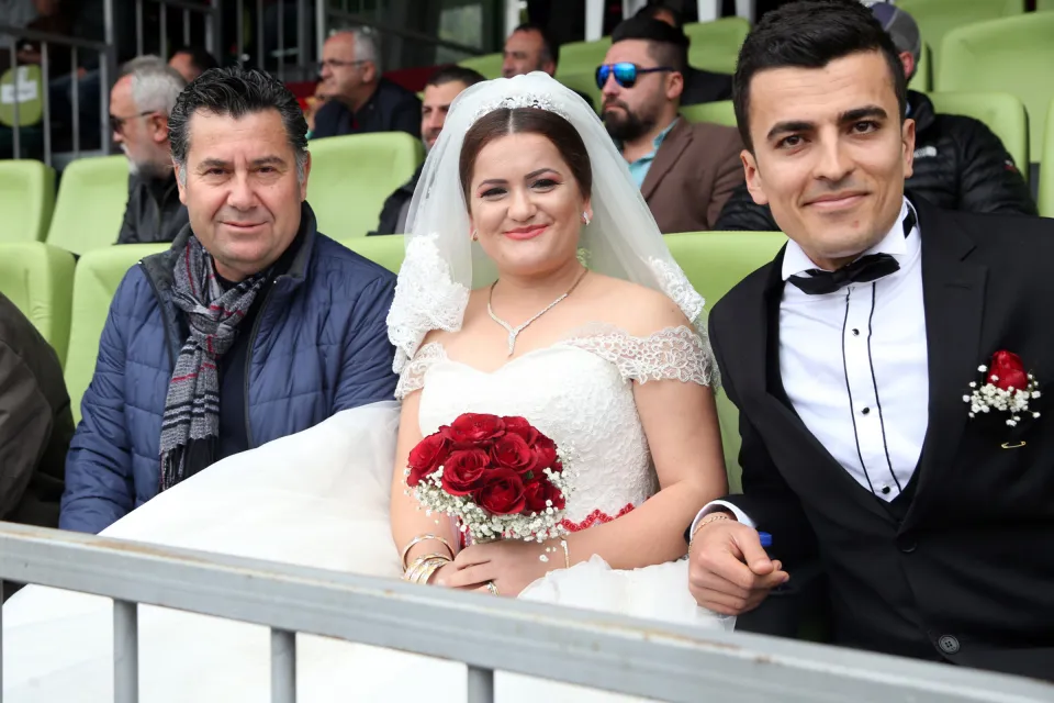 Yeşil-beyazlı ev sahibi ekibin maçlarını kaçırmayan damat Kurusıkı, nikah tarihi maçla aynı güne denk gelmesi nedeniyle gelinle stada geldi. Tribünde gelin ve damadı ilk gördüklerinde şaşkınlık yaşayan taraftarlar, daha sonra alkışlayıp tezahüratlarla çifte mutluluk diledi.