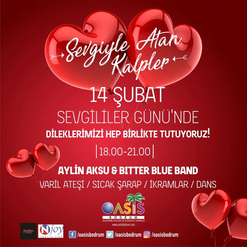14 Şubat’ta, dilekler hep birlikte Oasis’te tutulacak. Bodrum’un yaşam merkezi Oasis Alışveriş Kültür ve Eğlence Merkezi, 14 Şubat Sevgililer Günü geleneksel sokak partisinde bu yıl da ziyaretçilerine çok keyifli bir akşam yaşatacak. Aylin Aksu & Bitter Blue Band şarkıları eşliğinde, varil ateşi etrafında, sıcak şarap, ikramlar ve dans gösterileri ile sevgi tüm kalplerde hissedilecek.