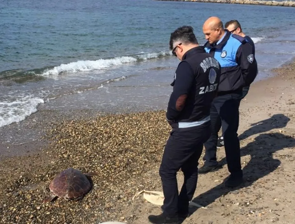 Olay yerine gelen ekiplerin yaptıkları incelemede, olta iğnesi yuttuğu belirlenen deniz kaplumbağasının bir süre önce telef olduğu ifade edildi.