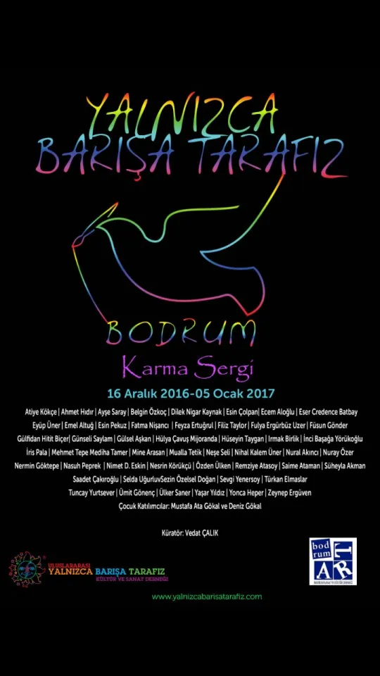 Uluslararası Yalnızca Barışa Tarafız Kültür ve Sanat Derneği, küratörlüğünü Vedat Çalık’ın üstlendiği bir karma sergiye imza atacak. Dünyanın 43 ülkesinde eş zamanlı olarak gerçekleştirilecek olan "Yalnızca Barışa Tarafız" sergilerinin Bodrum ayağı ise Dibeklihan’da 16 Aralık’ta açılacak ve 05 Ocak’a kadar görülebilecek.