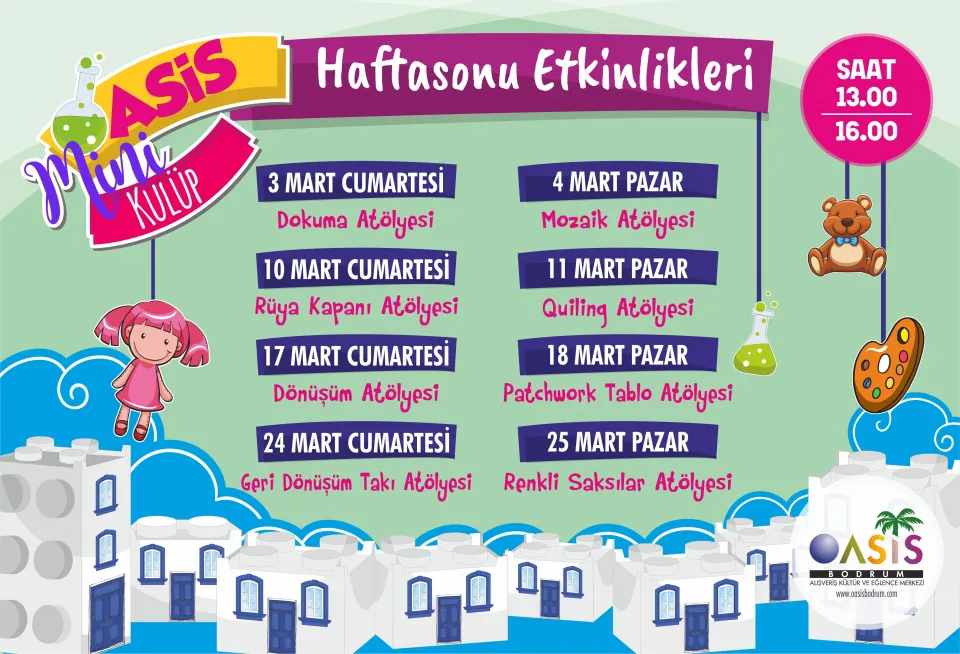 Anne-babaların ve çocukların vazgeçilmezi Oasis, hafta sonlarını daha eğlenceli kılmaya devam ediyor. Mart ayı boyunca her hafta sonu, Mini Kulüp’te gerçekleşecek olan atölyeler ile çocuklar hem eğlenecek, hem öğrenecek.