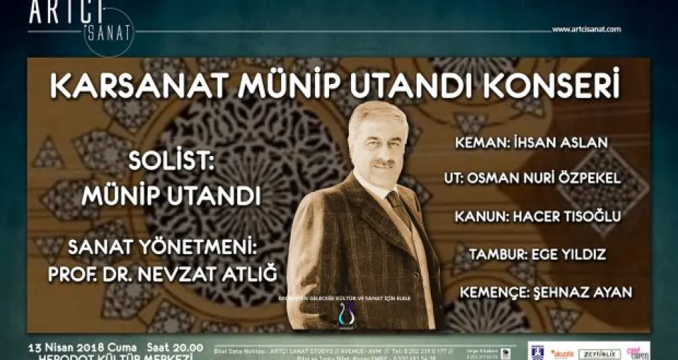 Karya Kültür ve Sanat Derneği, 13 Nisan 2018 Cuma günü, Herodot Kültür Merkez’inde saat 20.00 de derneğin kurucu üyesi Devlet Sanatçısı Dr. Nevzat Atlığ’ın sanat yönetmenliğini yaptığı, yılın bahar konserini sunacaktır. Türk Müziğinin en değerli seslerinden biri olan Cumhurbaşkanlığı Klasik Türk Müziği Korosu’nun solisti Münip Utandı konserin solisti..