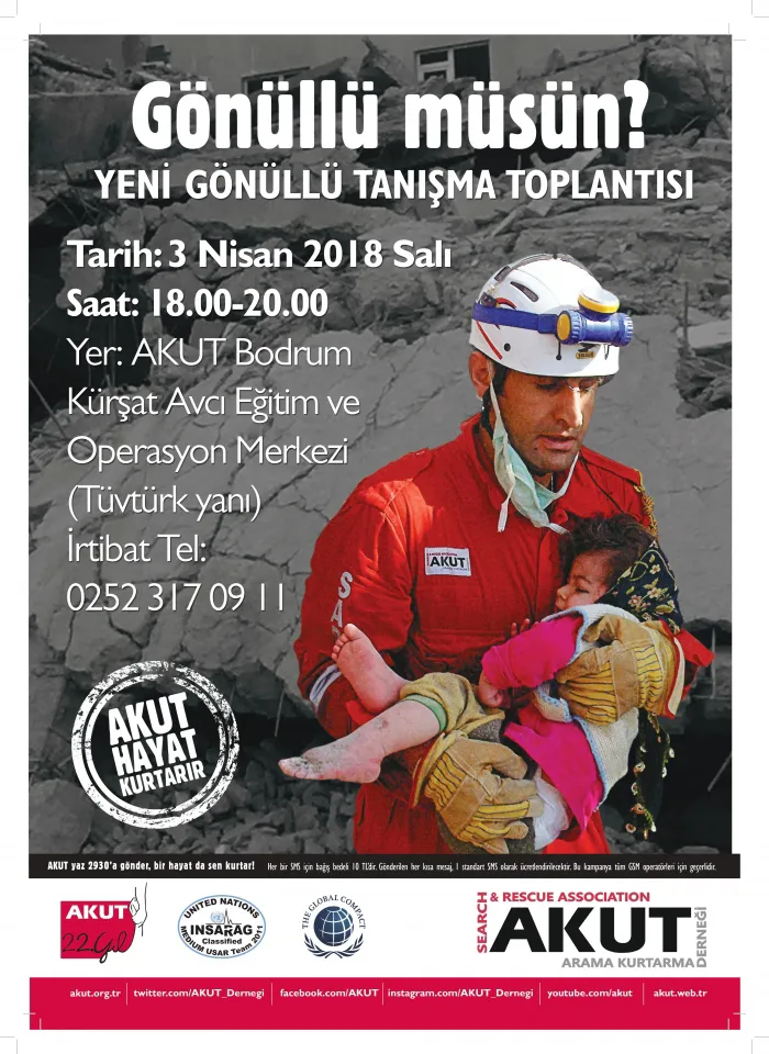 Kurulduğu 2008 yılı Şubat ayından bu güne kadar, Van depremi dahil olmak üzere denizde ve karada İnsan kurtarmadan yangına, yavru bir kedi den 800 kg lık hamile ineğe, sosyal sorumluluk projelerinden toplum bilinçlendirmesine kadar, ülkemiz ve canlılar için faydalı her konuda çalışmalarını sürdüren AKUT Bodrum Ekibi, üçer aylık rutin programı çerçevesinde, gönüllü olmak isteyenler için 3 Nisan Salı akşamı saat 18:00 ile 20:00 arasında, Konacık mahallesi AKUT Kürşat Avcı Operasyon ve Eğitim Merkezinde tanışma toplantısı düzenliyor.