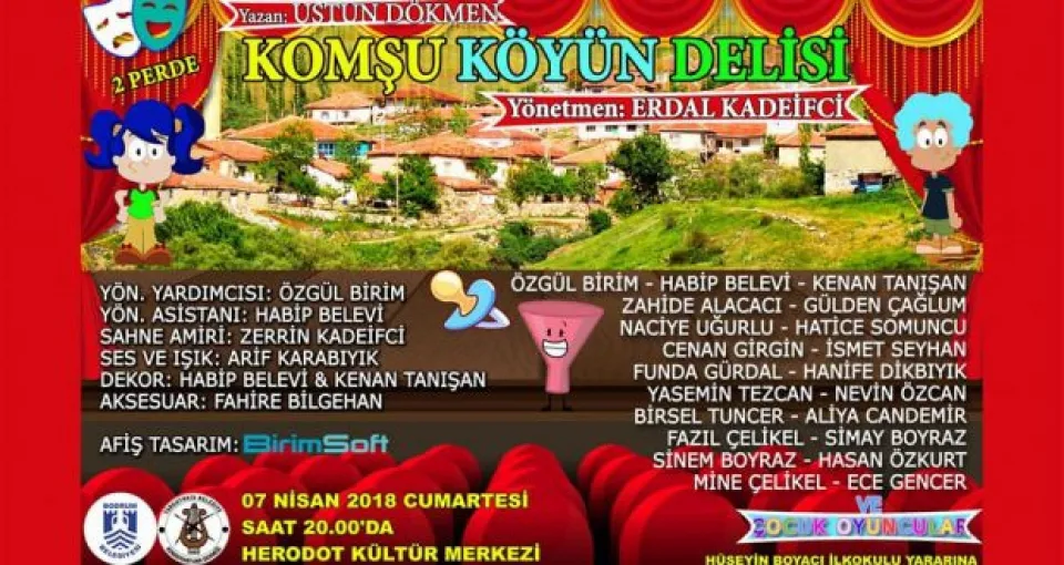 “Komşu Köyün Delisi” tiyatro oyunu, Heredot Kültür Merkezi’nde, Hüseyin Boyacı İlkokulu yararına, 07 Nisan 2018 tarihinde, cumartesi akşamı saat: 20.00’de yeniden tiyatro severlerle buluşacak.