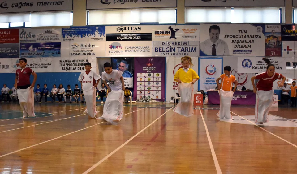 Binnaz Karakaya Spor Salonu'ndaki etkinlikte, ilkokul ve ortaokul öğrencileri topaç çevirme, halat çekme ve çuval oyunu gibi eski oyunları oynamanın keyfini yaşadı.
