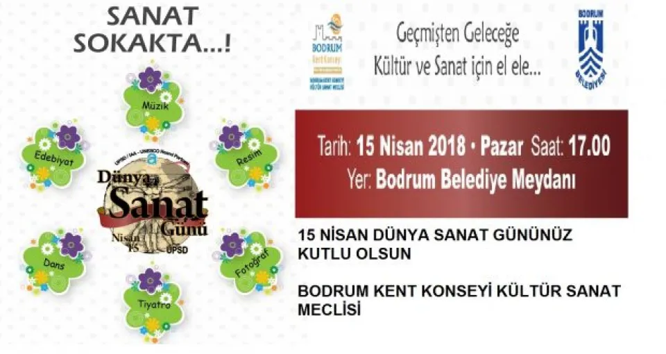 Bodrum Kent Konseyi Kültür Sanat Meclisi 15 Nisan Dünya Sanat Günü’nü “Sanat Sokakta” sloganıyla sokaklara taşıyor. Bodrum Belediyesi’nin destekleri ile gerçekleşecek etkinlik, çeşitli sanat disiplinlerindeki sanatçıların katkıları ile, 15 Nisan Pazar Günü Saat 17.00’de Bodrum Belediye Meydanı’nda başlıyor.
