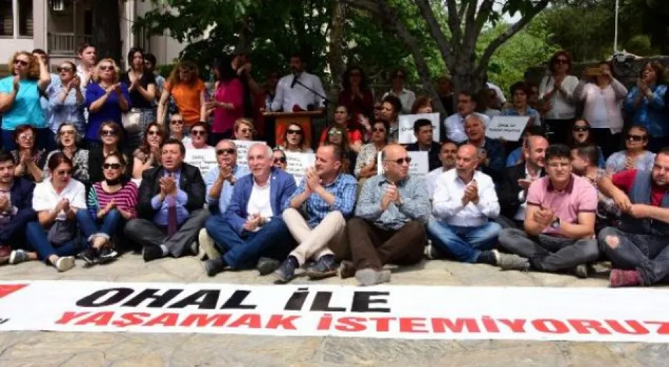 CHP Muğla İl Başkanlığı tarafından Menteşe ilçesindeki Sınırsızlık Meydanı'nda yapılan 5 dakikalık oturma eylemine yoğun katılım oldu. CHP Muğla Milletvekili Ömer Süha Aldan, ilçe belediye başkanları ve çok sayıda partilinin katıldığı eylemde, Faşizme karşı omuz omuza ve OHAL'de yaşamak istemiyoruz sloganları atıldı. Eylem öncesi açıklama yapan CHP Muğla İl Başkanı Mürsel Alban, Ülkemizi tek adam rejimine dönüştürme amacıyla hazırlanan ve tarihe mühürsüz seçim olarak geçen 16 Nisan referandumunun üzerinden tam 1 yıl geçti. 15 Temmuz'daki FETÖ darbe girişiminin ardından 20 Temmuz'da ilan edilen OHAL altında gidilen referandum, meşruiyeti olmayan bir rejim değişikliğini ülkemize dayatmıştır. Sivil darbe ortamında 'evet' demenin devletin tüm kurumlarıyla desteklendiği, 'hayır' demenin ise adeta yasaklandığı bir dönem yaşanmıştır dedi. Ülkenin 21 aydır OHAL'le yönetildiğini belirten Alban, İlan edilişindeki amacından uzaklaşarak demokrasi ve hukuk sistemine yönelik bir saldırıya dönüşen OHAL rejimi, insan haklarını, ifade özgürlüğünü ve her türlü protesto eylemini baskılamanın da aracı olmuştur. KHK'lar eliyle parlamento, yani halkın iradesi gasp edilmiştir. Türkiye'yi tek tipe sokmak için sendikalar, meslek oda ve birlikleri ile sivil toplum kuruluşlarına yönelik operasyonların ardı arkası kesilmemiştir diye konuştu.