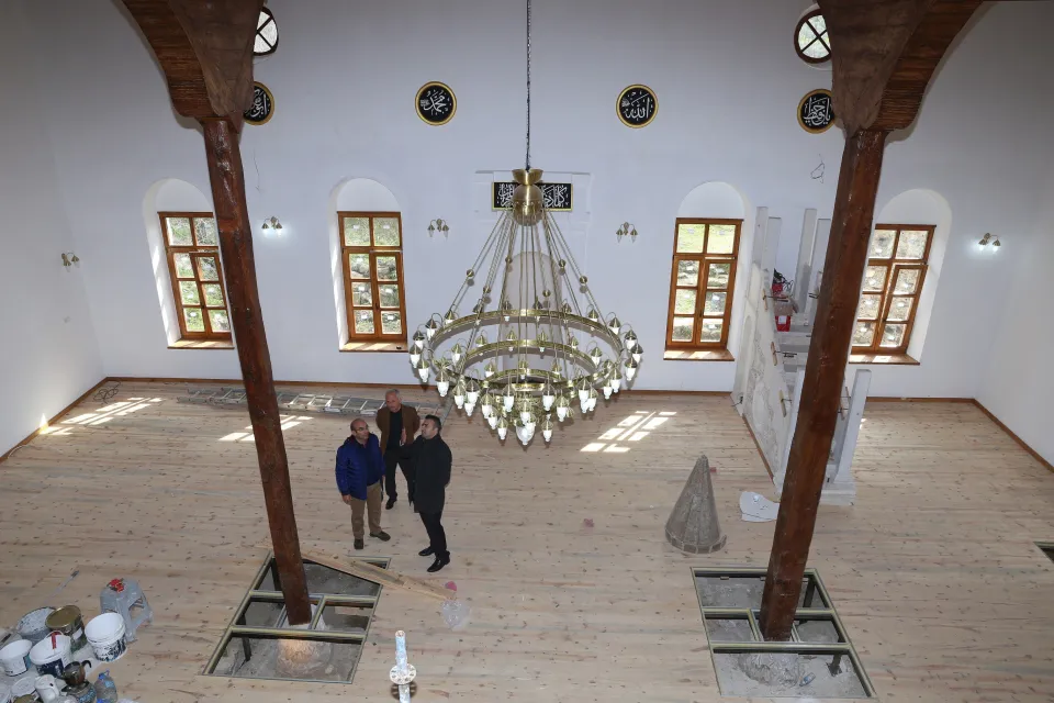 "Taş mihrabıyla taş minberiyle sade bir iç dizaynı ve ahşap yapısı ile önündeki sadaka taşıyla özgün bir cami. Kazılarda 15'inci yüzyıla ait caminin zeminini, minberini, hatta kapı ve pencerelerin yerine varıncaya kadar tespit ettik. Şimdiki camiyi de hem eski caminin görülebileceği hem de yeni caminin kullanılabileceği şekliyle düzenledik. Böylelikle, antik kentin bütününde olduğu şekilde camide de hem farklı dönemlerin gözüktüğü hem de gelen insanların ibadetlerini yapabileceği şekle getirdik."