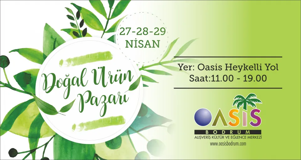 Bu bahar doğallığın verdiği enerji Oasis’te yakalanacak. 27-28-29 Nisan tarihlerinde, Bodrum’da faaliyet gösteren çeşitli firmalara ait doğal ve organik ürünler Oasis Alışveriş Kültür ve Eğlence Merkezi, Heykelli Yol’da sergilenecek ve satışa sunulacak.