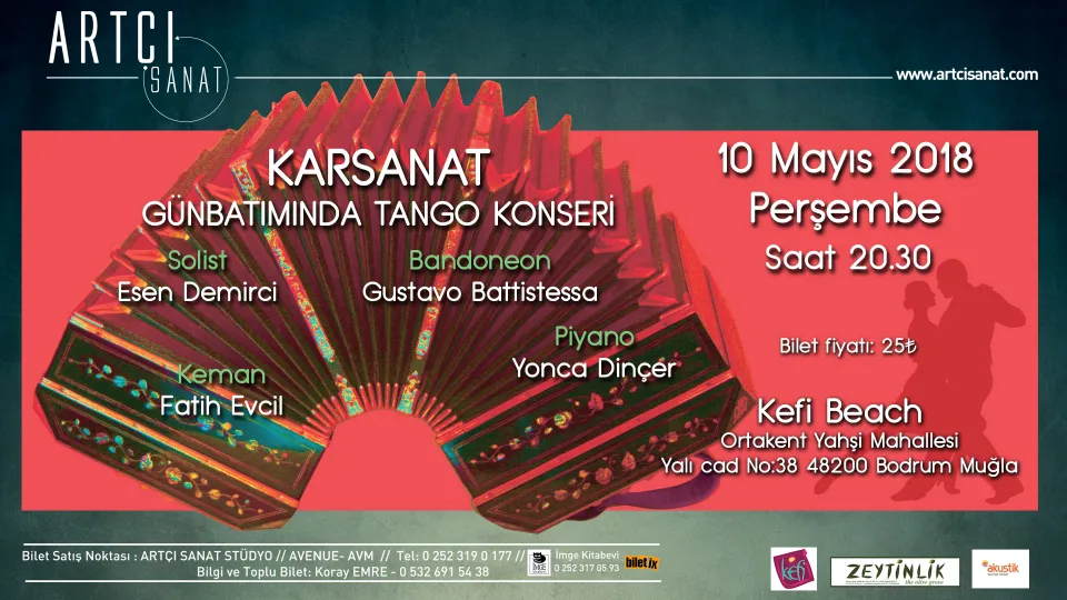 Karya Kültür ve Sanat Derneği (Karsanat) , 10 Mayıs Perşembe akşamı Bodrum'un incisi Ortakent Sahili'nde bulunan Kefi Beach'in muhteşem atmosferinde, gün batımı saatinde düzenlediği Tango konseri ile Bodrumlular'ı hep birlikte "yaza merhaba" demeye davet ediyor.