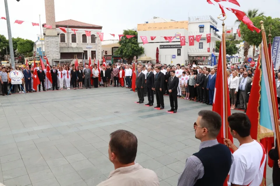 Belediye Meydanı'ndaki Atatürk Anıtı önünde düzenlenen ilk törene Bodrum Kaymakamı Bekir Yılmaz, Bodrum Cumhuriyet Başsavcısı Dr. Barış Duman, Bodrum Belediye Başkan Vekili Niyazi Atare, Gençlik ve Spor İlçe Müdürü Fatih Uzunlulu, Bodrum İlçe Milli Eğitim Müdürü Emin Geçin, Bodrum Belediye Başkan Yardımcısı Taner Uslu, Muharip Gaziler Derneği Bodrum Şubesi üyeleri ile siyasi parti ve çeşitli sivil toplum kuruluşu temsilcileri, okul idarecileri, öğretmenler, öğrenciler ve vatandaşlar katıldı.