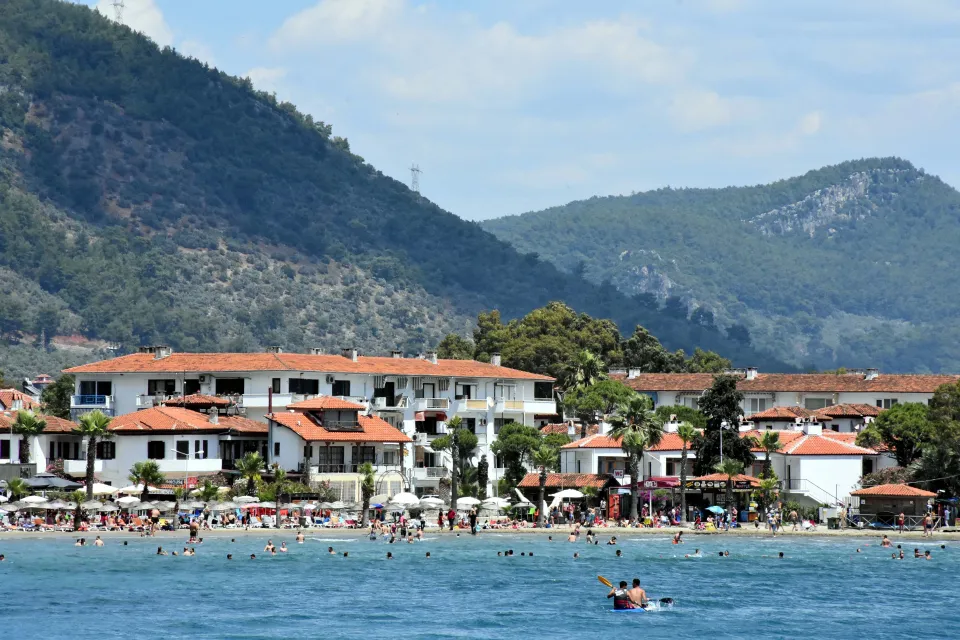 Muğla ve yakın illerden gelen çok sayıda yerli turist, Akyaka sahilinde denize girmenin keyfini yaşadı.