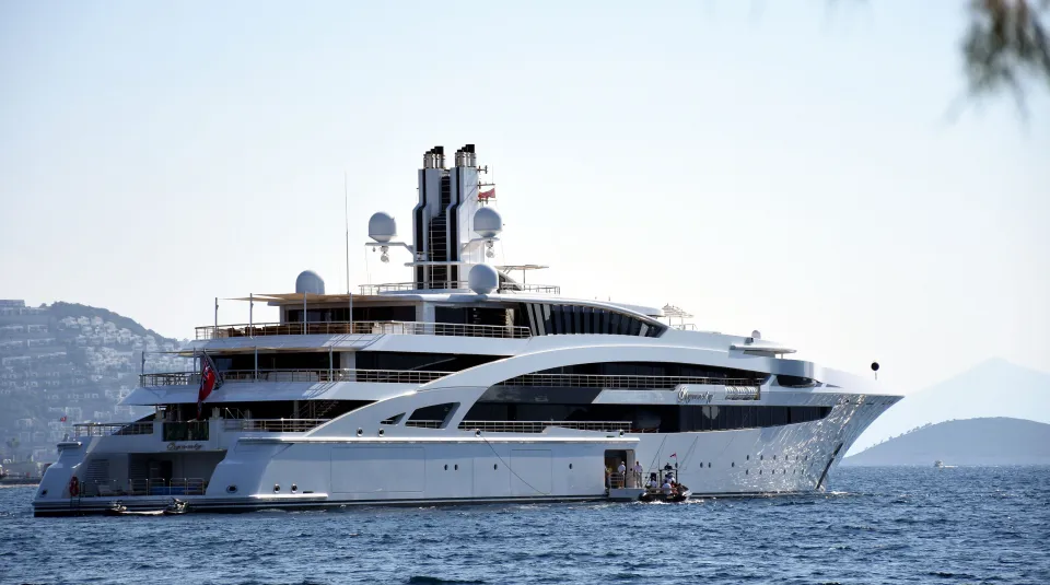 Kazak milyarder iş adamı Alijan İbragimov'a ait olduğu belirtilen 101 metre uzunluğundaki yaklaşık 200 milyon dolarlık Cayman bayraklı mega yat, Bodrum'un Yalıkavak sahili açıklarına demirledi.