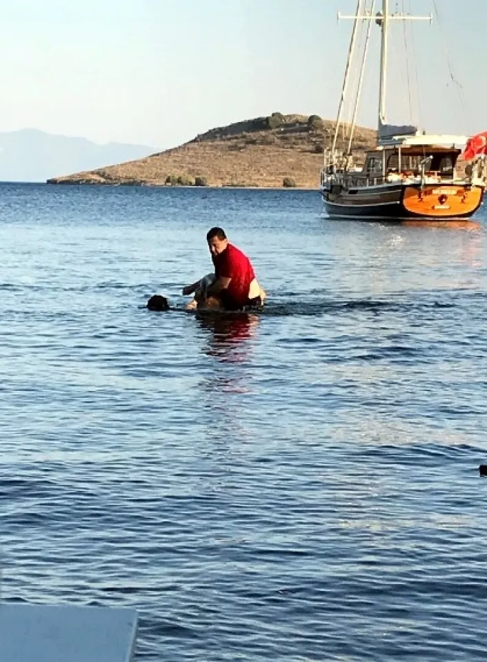 Alınan bilgiye göre, Muğla'nın Bodrum ilçesi Ortakent-Yahşi sahilindeki evinin önünde oturan Mehmet Kocadon ve ağabeyi Bodrum Ticaret Odası Başkanı Mahmut Serdar Kocadon, sahilden biraz açıkta su üzerinde hareketsiz biri olduğunu fark etti.