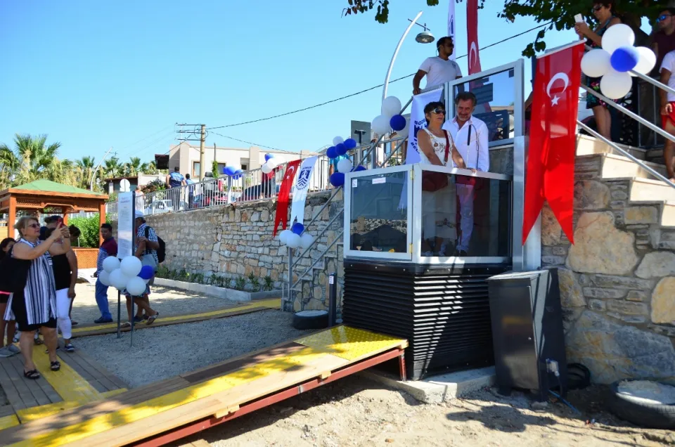 Bodrum Belediyesi Çevre Koruma ve Kontrol Müdürlüğü tarafından koordine edilen proje kapsamında Kumbahçe Halk Plajı’nda yapılan çalışmada, engelli bireylerin denize rahatça ulaşabilmeleri için asansör ile sahil kısmına iniş sistemi kuruldu. Asansör çıkışında ise kabartmalı sarı şeritlerin bulunduğu ahşap yoldan ilerleyerek engelli bireylerin tek başlarına denize ulaşımları sağlandı.