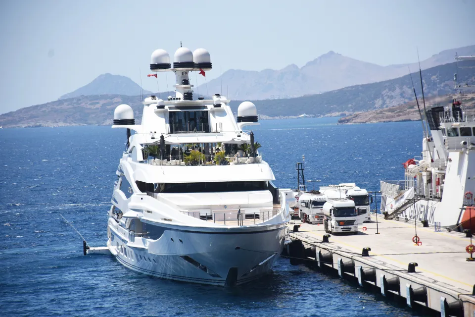 Piyasa değeri yaklaşık 150 milyon dolar olduğu belirtilen motoryata, gün içerisinde 192 bin litre yakıt ikmali yapıldı. İngiliz iş adamı Philip Green'e ait olduğu ifade edilen yatın yakıtının, İzmir Aliağa'dan getirildiği öğrenildi. Lüks motoryat, yakıt ikmali yaptıktan sonra İstanköy Adası'na (Kos) gitmek üzere ilçeden hareket etti.