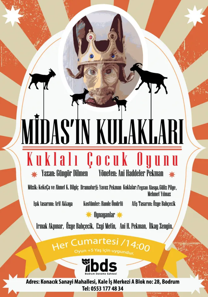 Bodrum Deneme Sahnesinde bu ayın en sevindirici haberlerinden biri de yeni çocuk oyunu. Güngör Dilmen’in bir klasiğe dönüşmüş olan eseri “Midas’ın Kulakları”, kuklalı bir çocuk oyunu olarak karşımızda. Ani H. Pekman’ın yönettiği oyunda, Irmak Akpınar,Özge Bahçecik, Ani H. Pekman, Ezgi Metin, İlkay Zengin oynuyor.Müzik tasarımı Ayşe Akarsu ve Gökçe Gürçay’a ait olan “Midas’ın Kulakları”, 18 Ağustos’tan itibaren her Cumartesi saat 14.00’de Bodrum Deneme Sahnesinde.