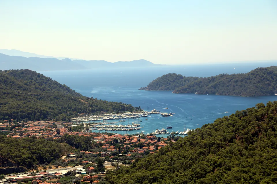 Fethiye ilçesinin doğal güzellikleriyle ünlü Göcek Mahallesi'ndeki bakir koylarda, çok sayıda turist mavi tura çıkıyor.