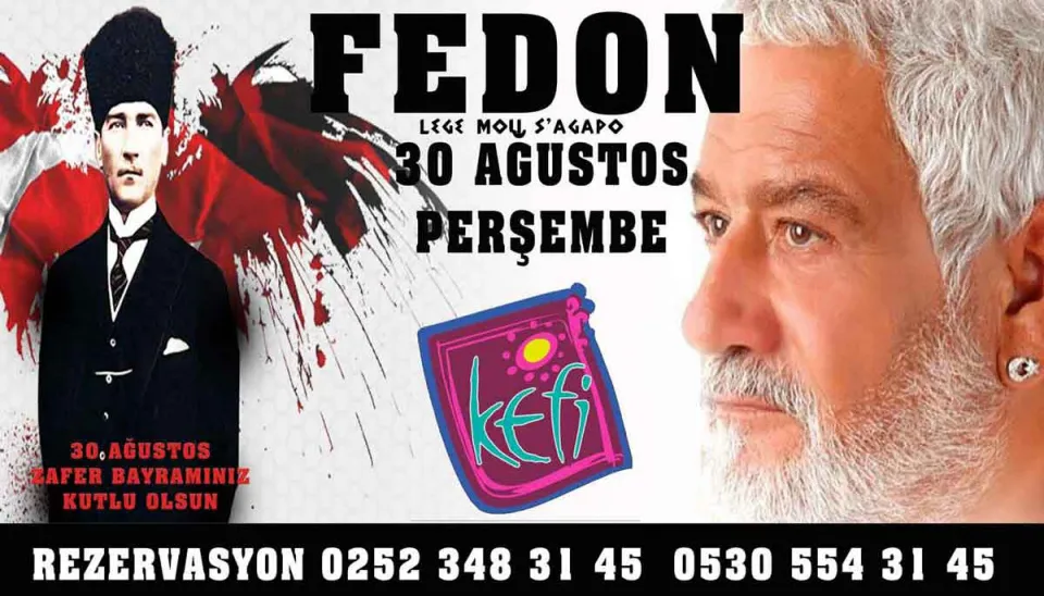 Bodrum Ortakent Yahşi Sahilinde yer alan Kefi, 30 Ağustos 2018 Perşembe akşamı ünlü sanatçı “Fedon” ile “Zafer Bayramı” coşkusunu yaşatacak.
