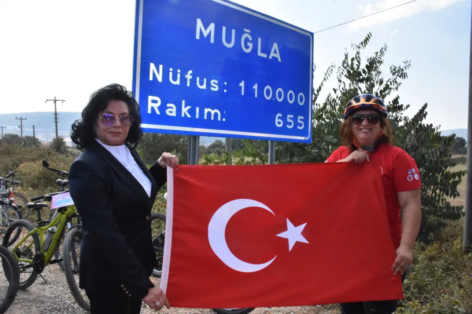 Bisiklet kullanmayı özendirmek, trafikteki kadın bisikletçilere dikkati çekmek ve ulusal bayramları kutlamak için yürütülen projeye katılan gönüllü bisikletçiler, Türk bayrağını kentin girişinde Muğla Mor Pedal Kadın Bisiklet Derneği Başkanı Yasemin Duygulu'ya teslim etti.