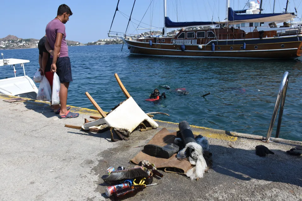 Deniz Ticaret Odası Bodrum Şubesinin de katkıda bulunduğu ve yaklaşık 1,5 saat süren temizlik çalışmasında, denizden cam ve plastik şişe, cep telefonları, otomobil lastiği, halat, plastik boru, halı, kova ve sandalye gibi çeşitli atıklar çıkarıldı.