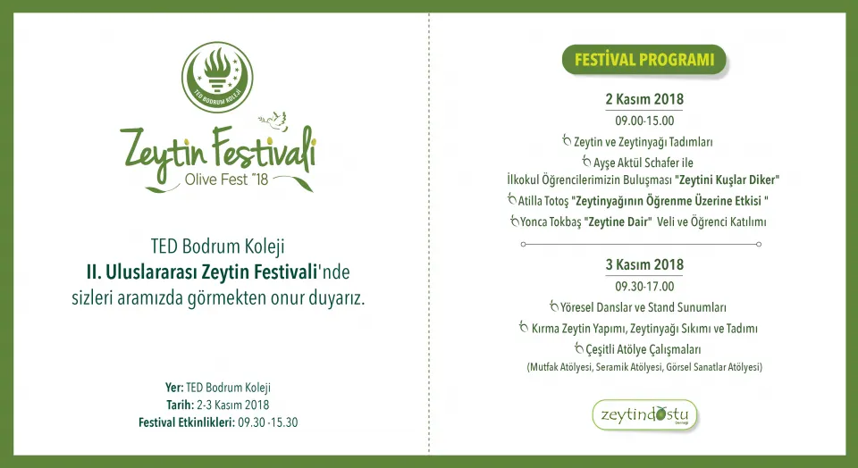 TED Bodrum Koleji II. Uluslararası Zeytin Festivali, zeytin meraklılarını; hayatına mutluluk, sofrasına lezzet, ömrüne barış ve dostluk katmak isteyen herkesi bu keyifli ve lezzet dolu festivalde; zamanın en güzel tanığı, yüzyıllardır yaşama, bilgeliğe ve insanlığa şahitlik eden zeytin ağaçları altında kurulmuş olan TED Bodrum Koleji’nde buluşturacak.
