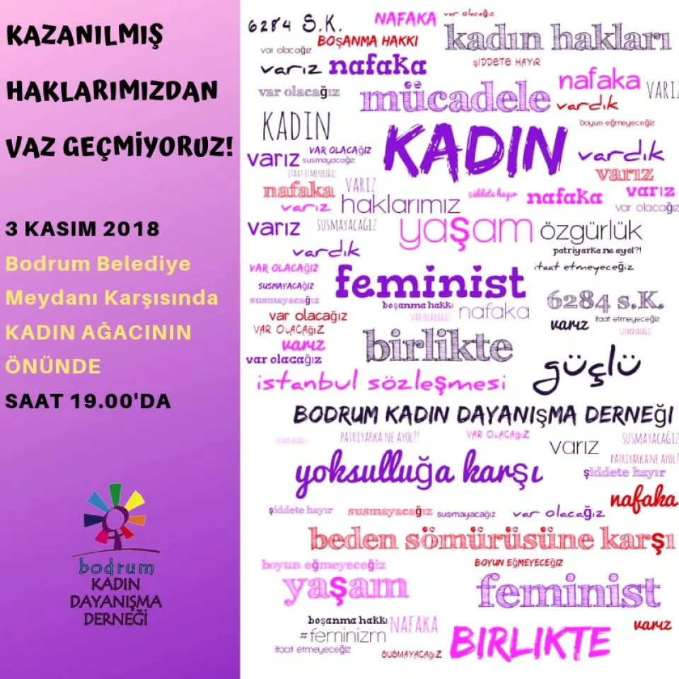 Cumartesi günü, 3 KASIM 2018 tarihinde saat 19.00'da Kadınlar Kazanılmış Haklarından VAZ GEÇMEYECEKLERİNİ ifade etmek üzere, Bodrum Belediye Meydanı Karşısındaki Kadın Ağacının önünde toplanacaklar.