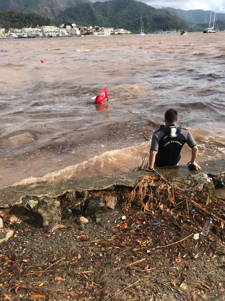 Marmaris Orman İşletme Müdürlüğü önünde bulunan dere ağzındaki bir teknenin su alarak karaya oturduğunu ve teknede asılı bulunan Türk bayrağının yağmurun neden olduğu selin getirdiği çamur ve çöp yığınları içerisinde kaldığını görenler, durumu Sahil Güvenlik ekiplerine bildirdi.