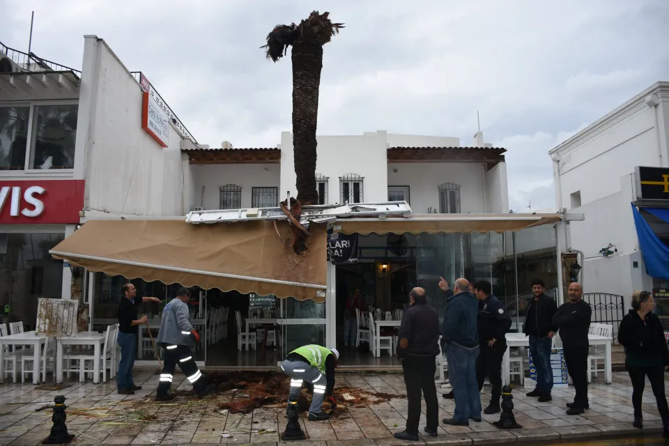 Bodrum ilçesinde, kırılan palmiye ağacının içinden geçtiği köfteci dükkanının çatısına devrildiği anlar iş yerinin güvenlik kamerasınca kaydedildi.