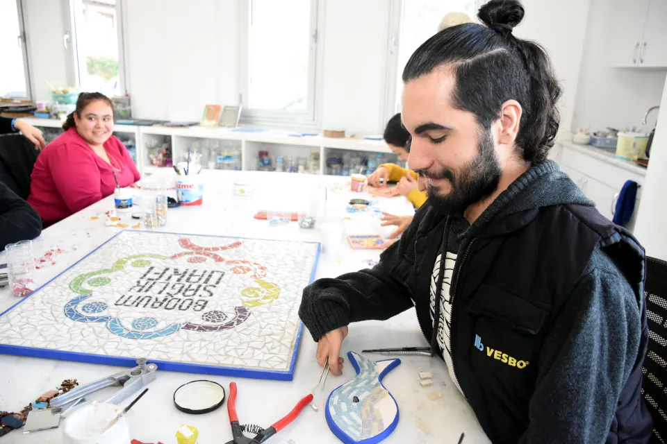 Bodrum Engelliler Sağlık Vakfı'nda eğitim gören bedensel, zihinsel, işitme ve otizmli bireyler, yaptıkları mozaik çalışmalarla hem el becerilerini geliştiriyor, hem de sosyal yaşama katılarak mutlu oluyor.