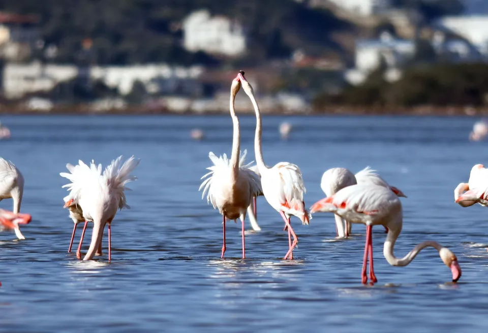 Türkiye'de, göçmen kuşlar için önemli sulak alanlardan Milas'taki Tuzla Sulak Alanı'na gelen flamingo ve farklı kuş türleri görsel şölen oluşturuyor.