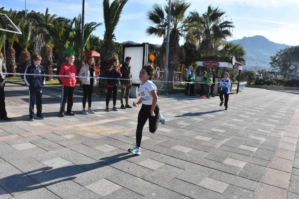 Turgutreis Sahilinde gerçekleştirilen koşuda, bazı öğrenciler zorlansa da yarışı büyük bir azimle bitirmeyi başardı.