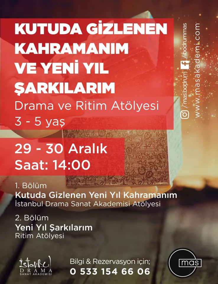 Drama ve ritim atölyesi olan “Kutuda Gizlenen Kahramanım ve Yeni Yıl Şarkılarım” Atölyesi 29 Aralık Cumartesi günü, 14:00’da 3 – 5 yaş aralığındaki küçük katılımcılarla düzenleniyor. Atölyede çocuklar, kutuda gizlenen sevimli Yeni Yıl Kahramanını canlandırırken, ritmin eğlence dolu dakikalarından keyif alıyorlar.