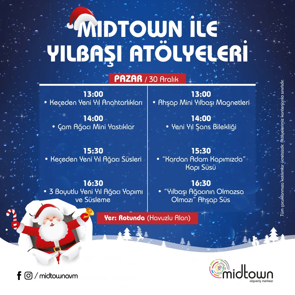 Yılbaşı kapsamında, 29 Aralık Cumartesi günü saat 14:00’da Bahçeşehir Koleji “Robotik ve Kodlama”, 30 Aralık Pazar günü saat 13:00’da ise keçe ve ahşaptan oluşan 8 farklı yılbaşı atölyeleri gerçekleşecektir. Pazar ve Pazartesi günleri ise Noel Baba, Alışveriş Merkezi içerisinde çocuklarla fotoğraf çekilecek ve sürpriz hediyeler dağıtıyor olacak. Etkinlikler, Midtown Alışveriş Merkezi Rotunda (Havuzlu alan)’da gerçekleşecektir.