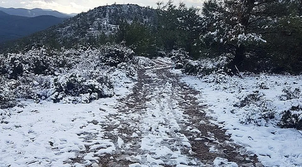 Soğuk hava nedeniyle Etrim Mahallesi'ndeki 538 metre rakımlı Etrim Kalesi Dağı'na kar yağdı.