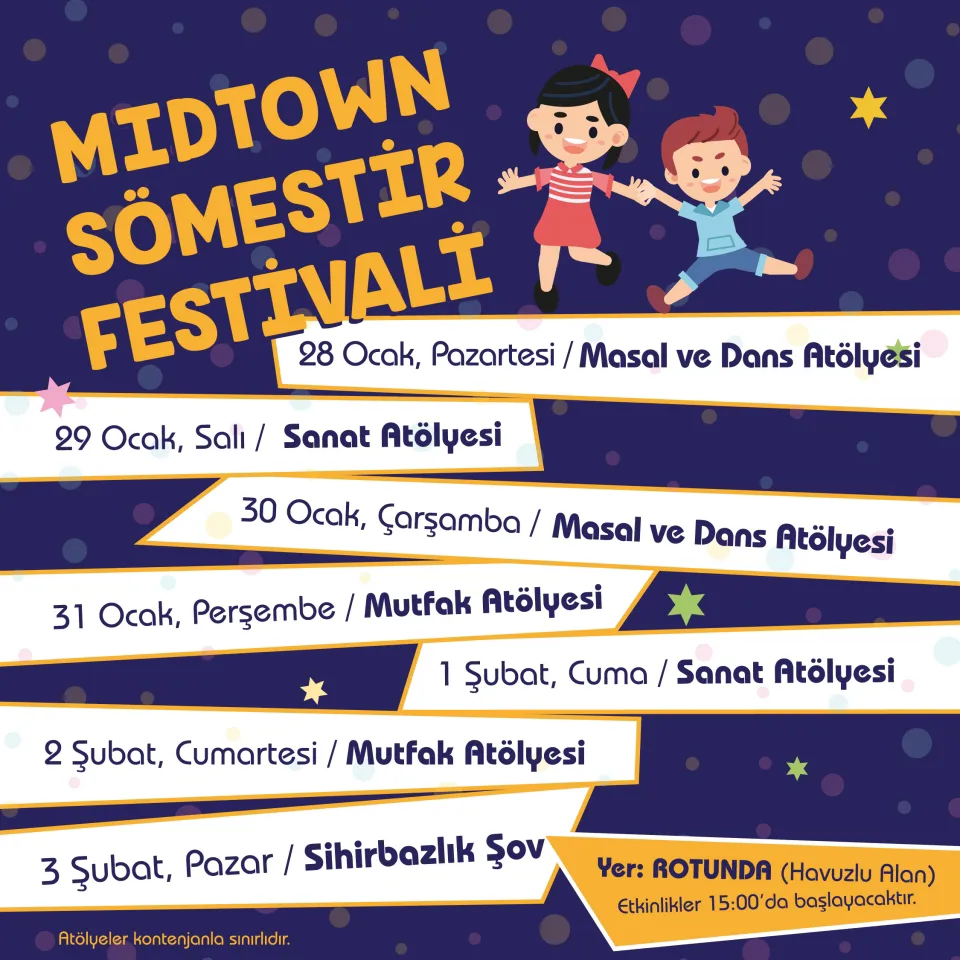 28 Ocak Pazartesi günü 15.00’da Masal, Dans ve Hareket atölyesi ile başlayacak festival, her gün aynı saatlerde gerçekleşecek ve 7 gün boyunca devam edecek. Festival kapsamında çocuklar sanat atölyelerinde eğlenirken bazı günler mutfakta el becerilerini geliştirecek. Midtown Sömestir Festivali, 3 Şubat Pazar günü 15:00’da Sihirbaz Şov ile sonlanacak.