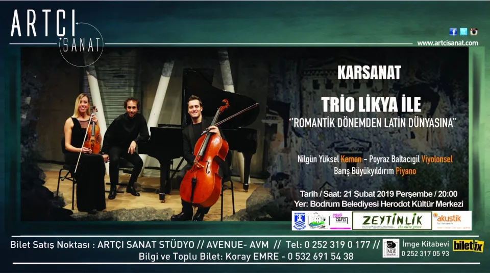Karsanat Sanat Kurulu üyelerinden, İstanbul Üniversitesi Devlet Konservatuarı Viyola Bölümü emekli öğretim üyelerinden Çiğdem Epikmen’in sanat danışmanlığında gerçekleşecek olan bu konserde, üyelerinin her biri solist ve orkestra üyesi olarak kendini kanıtlamış, Türkiye’de ve yurtdışında ülkemizi başarıyla temsil etmekte olan Trio Likya müzisyenleri Bodrumlu sanatseverlerle buluşuyor.