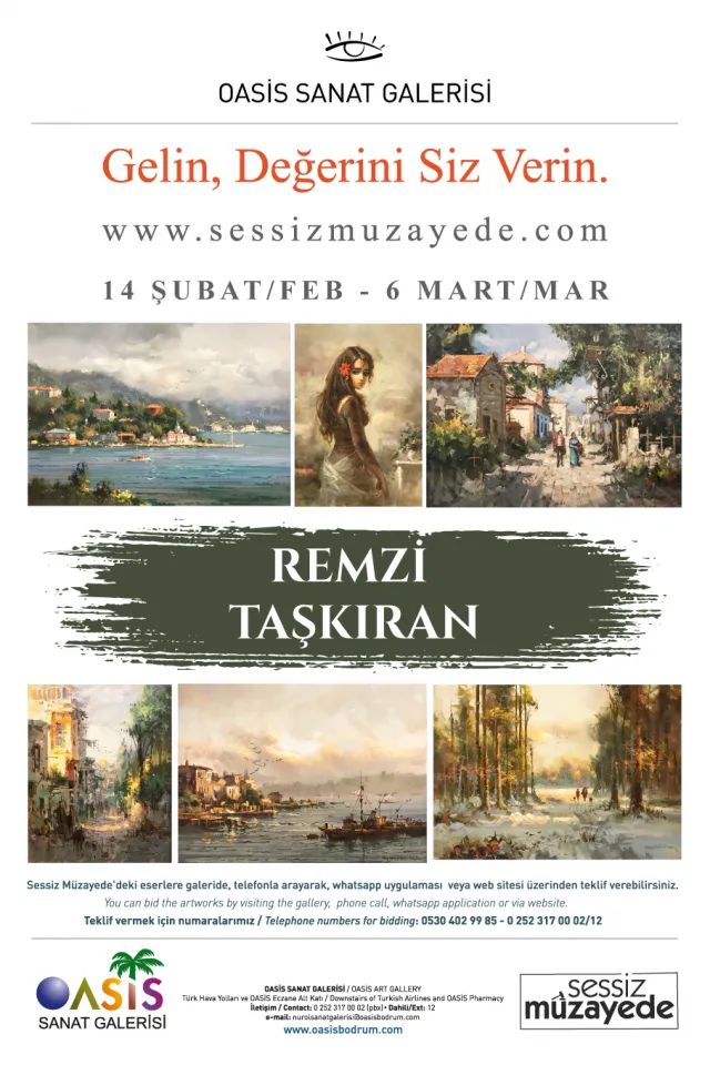 Bodrum Oasis Sanat Galerisi’nde Remzi Taşkıran’ın eserlerinden oluşan sessiz müzayede, 14 Şubat Perşembe günü www.sessizmüzayede.com'dan başlıyor. Oasis Sanat Galerisi ve Arp Sanat Galerisi'nin iş birliğiyle düzenlen müzayedede Remzi Taşkıran’ın yağlı boya ve suluboya eserleri yer alıyor.